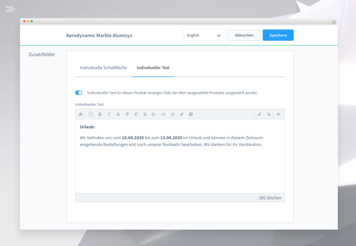 Furthermore, an custom text can also be displayed above the button, which can also be restricted to selected products. The text can be either an error message, a warning message, a info message, a success message or a normal text, for example for a holiday message or further explanations.