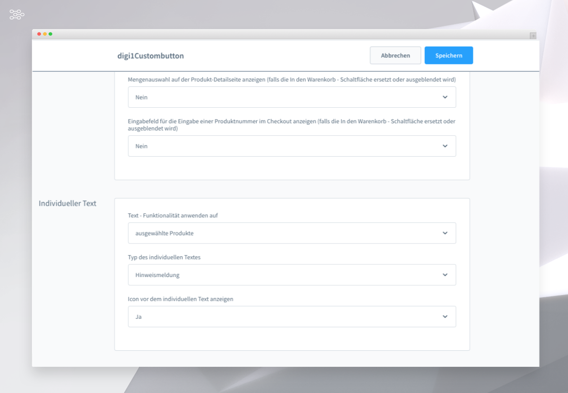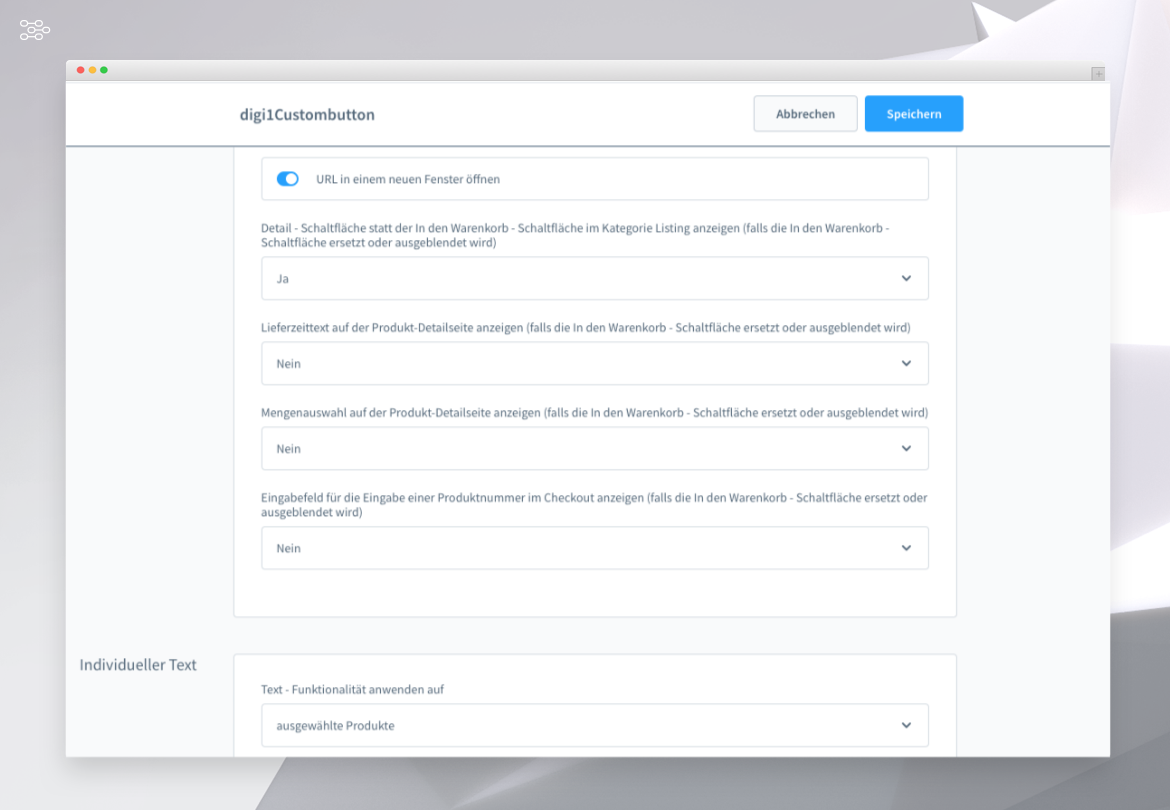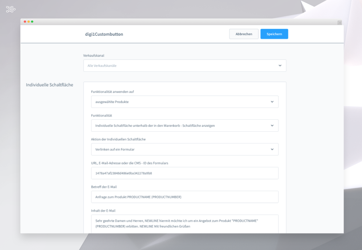 The custom button can either refer to a shopware form, to a link or to an email address. The subject and the email content can be specified for the email address.