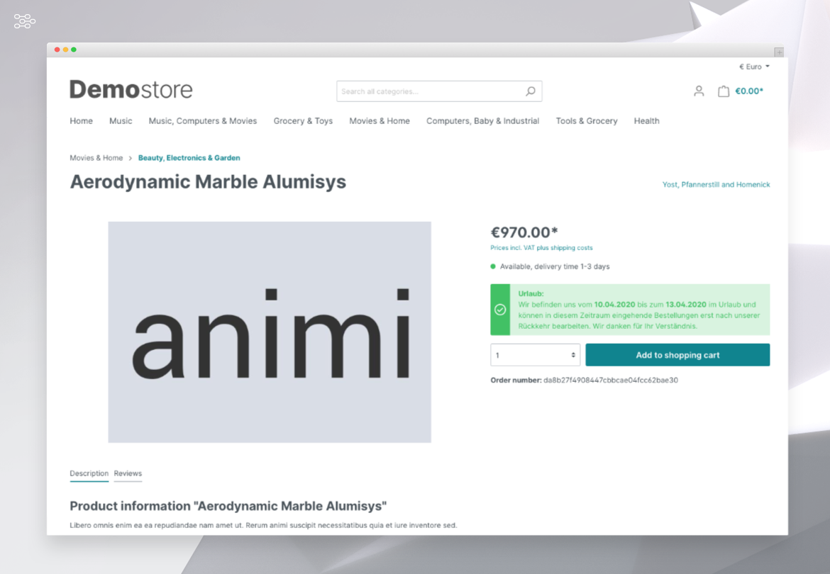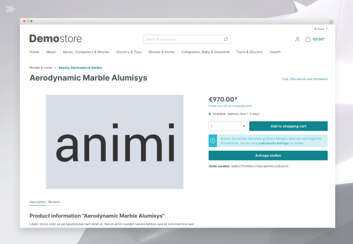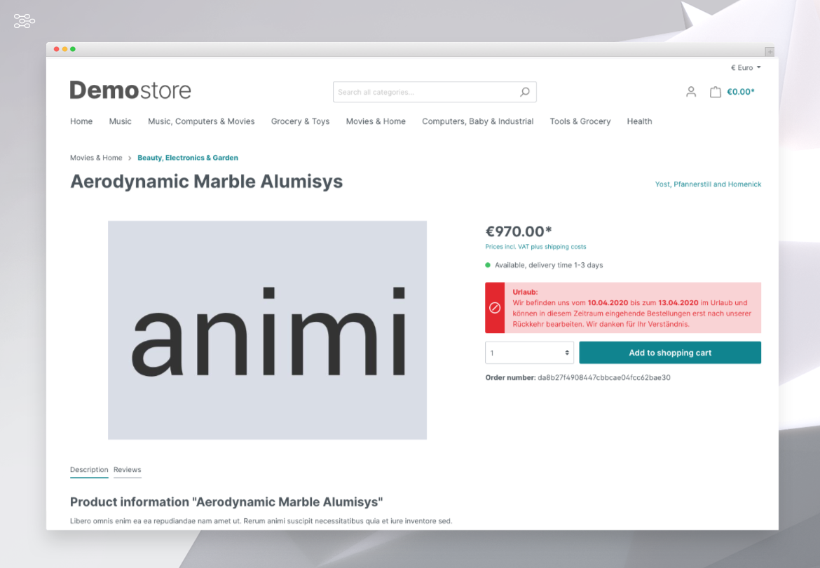 It is also possible to display the details button instead of the add to cart button in the category listing if the add to cart button has been replaced or hidden for the product. In this case, the delivery information text or the quantity selection can also be hidden on the product detail page, just like the input field for entering a product number in the checkout.