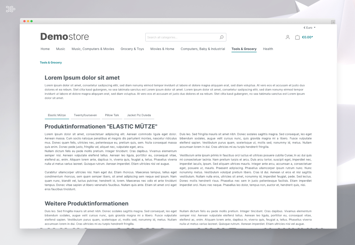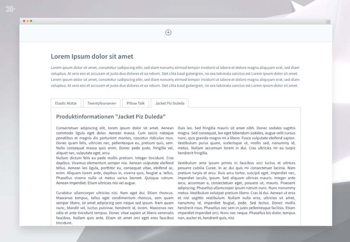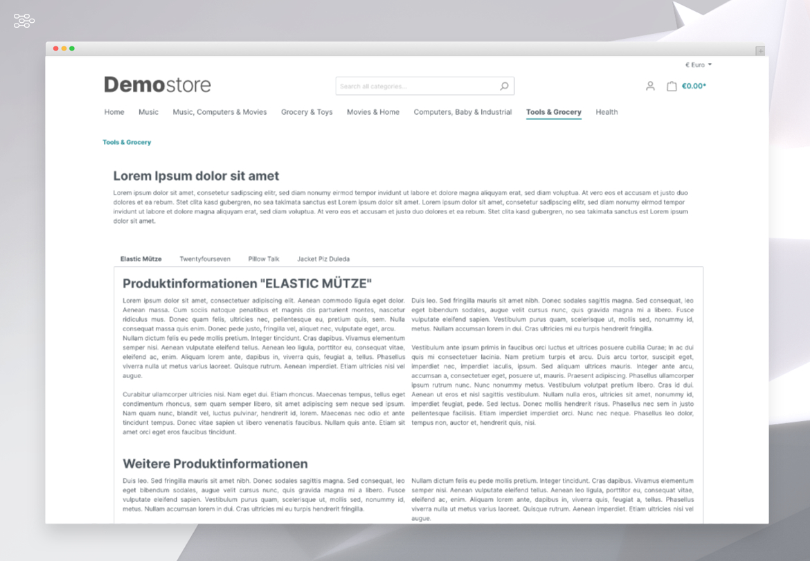 The plugin "Tabs for a CMS (e.g. for faq or career pages)" adds tabs to the CMS elements, that can be used as usual with an already placed CMS block (for example with "Text", "Two columns, text" or "Three columns, text") and assigned it to the CMS block using the change icon (when clicking on an element) and place it on an shopping world as often as you like. Up to 10 tabs can currently be assigned within the respective element.