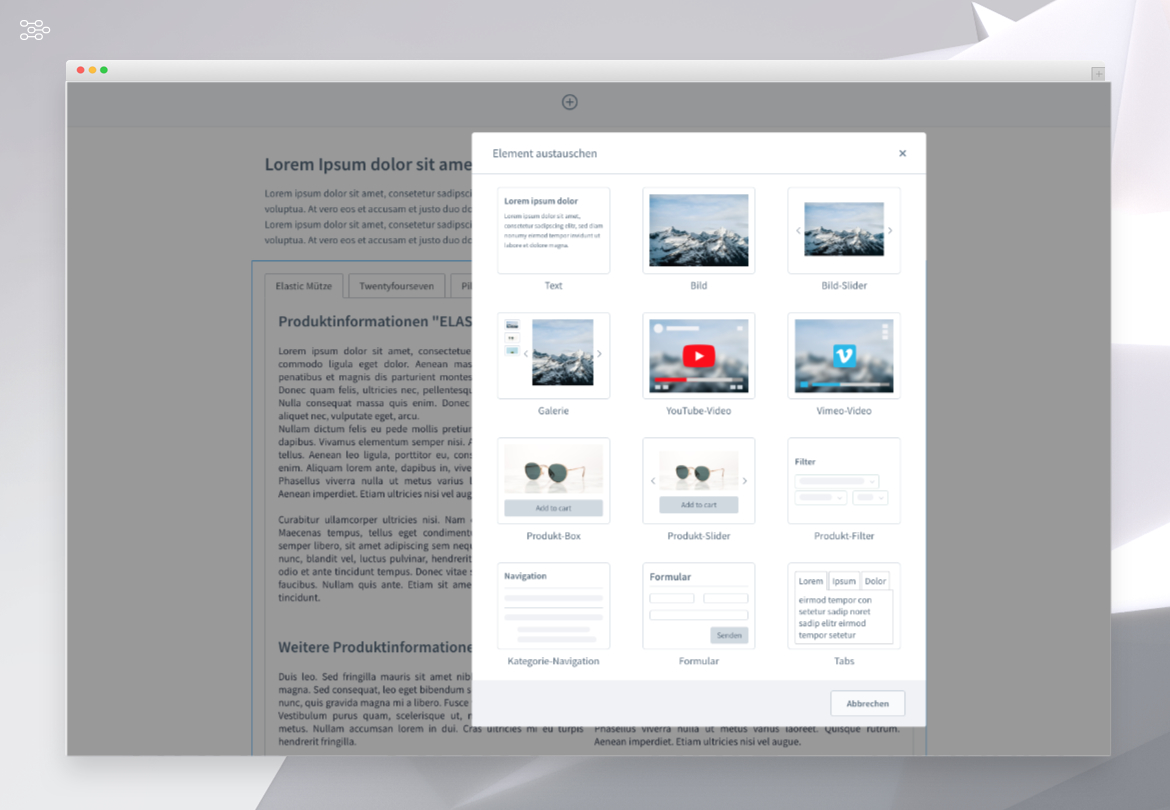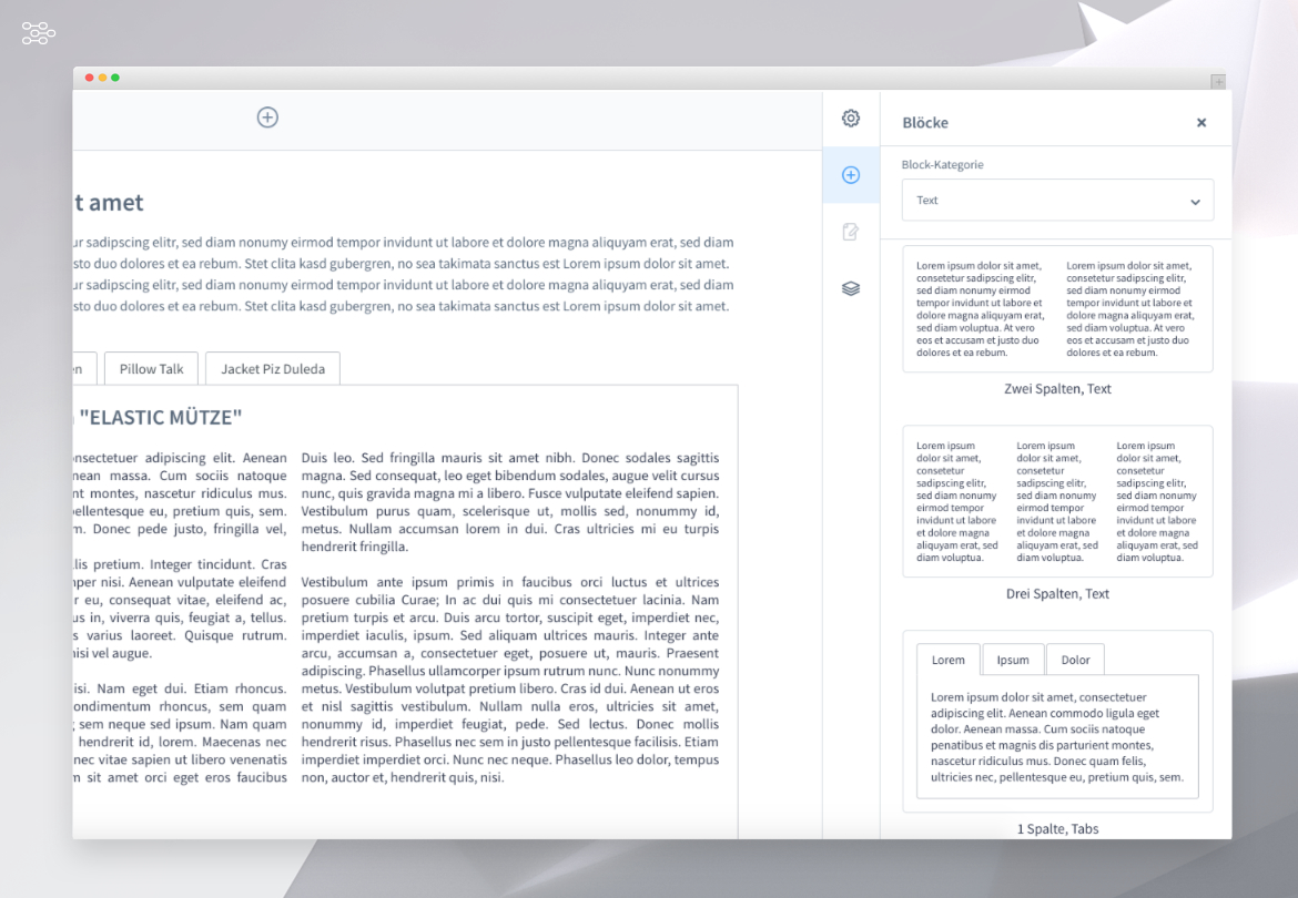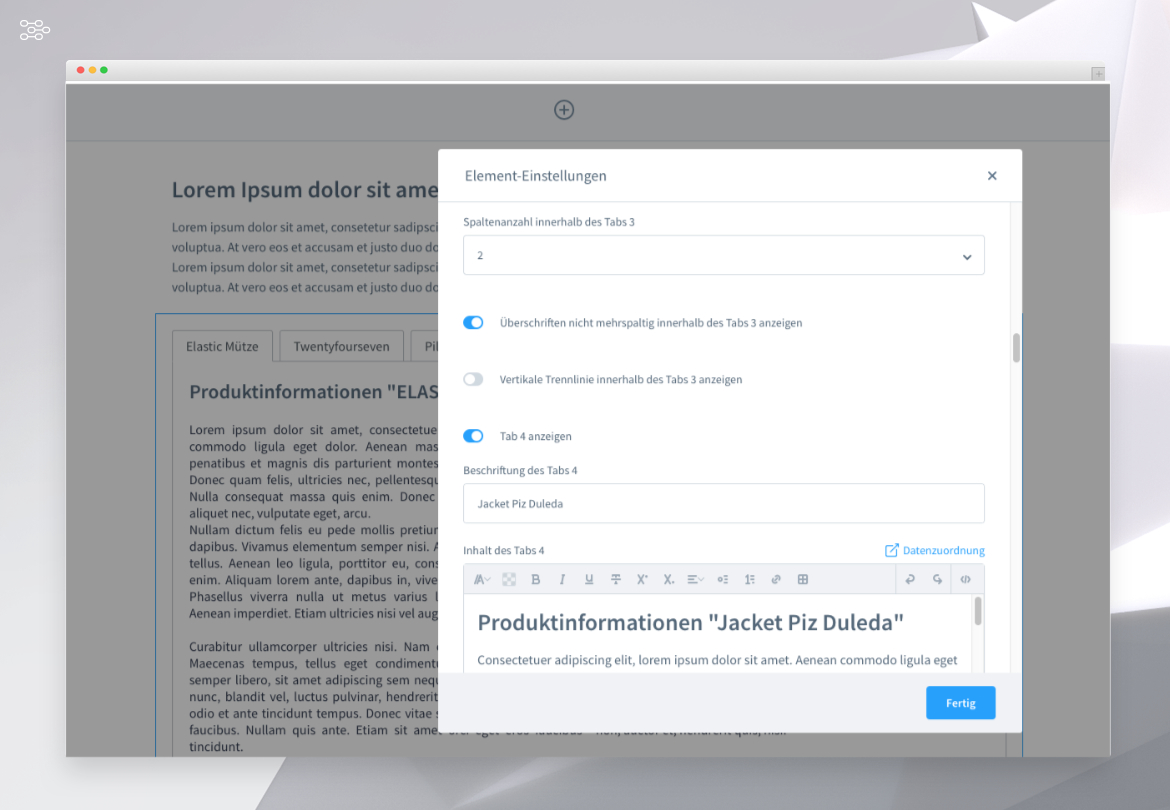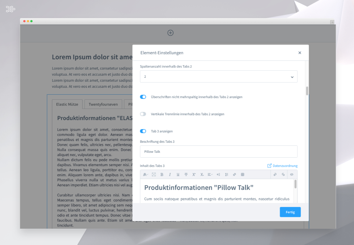 The plugin "Tabs for a CMS (e.g. for faq or career pages)" adds tabs to the CMS elements, that can be used as usual with an already placed CMS block (for example with "Text", "Two columns, text" or "Three columns, text") and assigned it to the CMS block using the change icon (when clicking on an element) and place it on an shopping world as often as you like. Up to 10 tabs can currently be assigned within the respective element.