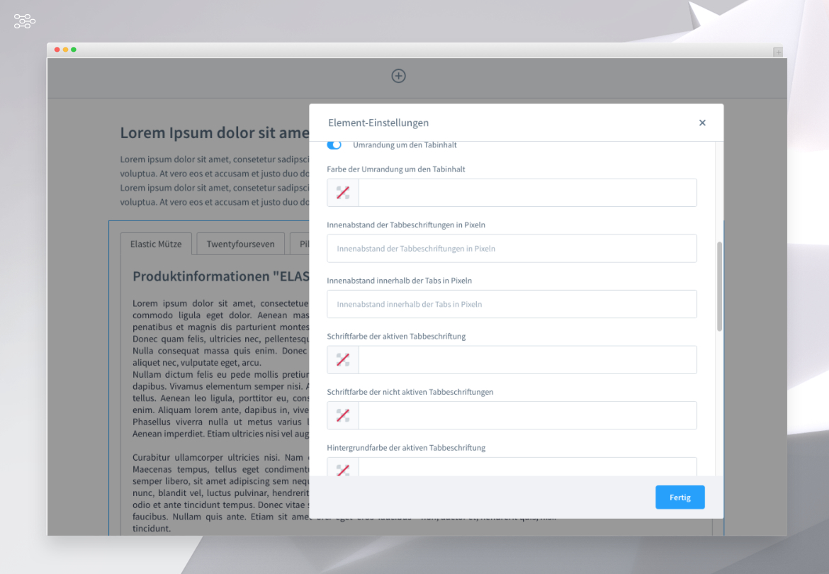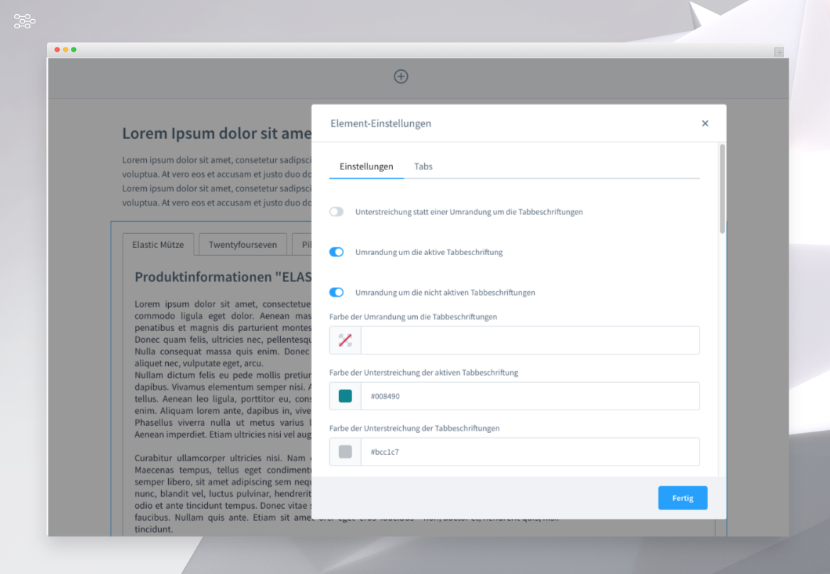 In the element for the tabs, you can select in the "Settings" tab whether a underline instead of a border around the tab labels should be used, whether a border around the active tab label, a border around the not active tab labels or a border around the tab content should be displayed. The color of the border can be selected for each border. In addition, you can also set the inner distance for the labelings in pixels, the inner distance inside the tabs in pixels, the font color of the active labeling, the font color of the not active labelings, the background color of the active labeling, the background color of the not active labelings, the font color inside the tabs, the background color inside the tabs and the color of the vertical dividing line inside the tabs. You can also specify which tab should be open at the beginning.